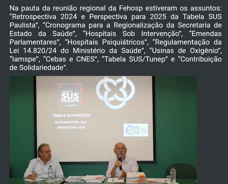 Na pauta da reunião regional da Fehosp estiveram os assuntos: “Retrospectiva 2024 e Perspectiva para 2025 da Tabela SUS Paulista”, “Cronograma para a Regionalização da Secretaria de Estado da Saúde”, “Hospitais Sob Intervenção”, “Emendas Parlamentares”, “Hospitais Psiquiátricos”, “Regulamentação da Lei 14.820/24 do Ministério da Saúde”, “Usinas de Oxigênio”, “Iamspe”, “Cebas e CNES”, “Tabela SUS/Tunep” e “Contribuição de Solidariedade”.