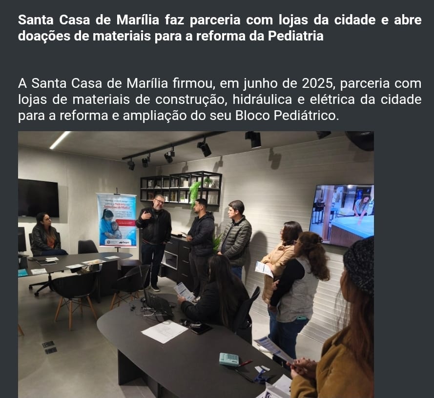 A Santa Casa de Marília firmou, em junho de 2025, parceria com lojas de materiais de construção, hidráulica e elétrica da cidade para a reforma e ampliação do seu Bloco Pediátrico.