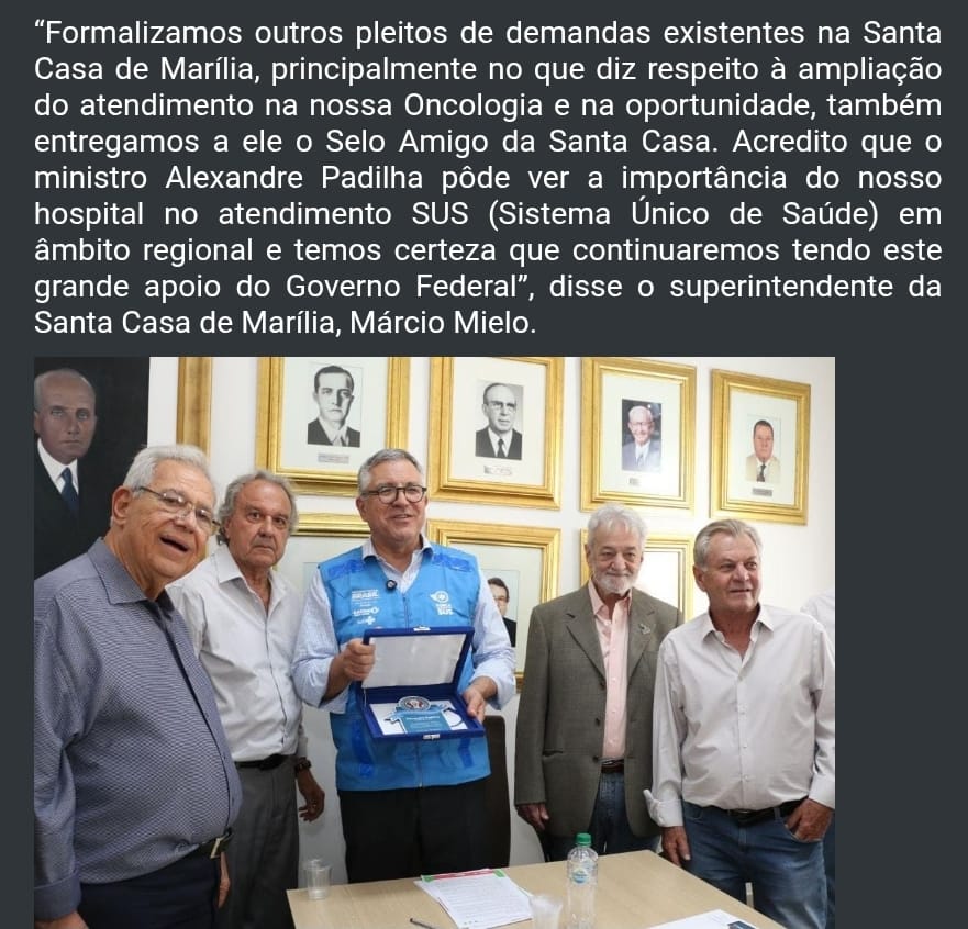 “Formalizamos outros pleitos de demandas existentes na Santa Casa de Marília, principalmente no que diz respeito à ampliação do atendimento na nossa Oncologia e na oportunidade, também entregamos a ele o Selo Amigo da Santa Casa. Acredito que o ministro Alexandre Padilha pôde ver a importância do nosso hospital no atendimento SUS (Sistema Único de Saúde) em âmbito regional e temos certeza que continuaremos tendo este grande apoio do Governo Federal”, disse o superintendente da Santa Casa de Marília, Márcio Mielo.