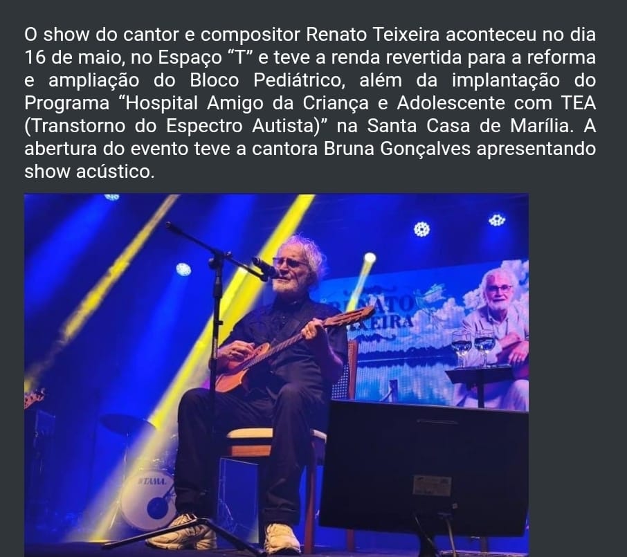 O show do cantor e compositor Renato Teixeira aconteceu no dia 16 de maio, no Espaço “T” e teve a renda revertida para a reforma e ampliação do Bloco Pediátrico, além da implantação do Programa “Hospital Amigo da Criança e Adolescente com TEA (Transtorno do Espectro Autista)” na Santa Casa de Marília. A abertura do evento teve a cantora Bruna Gonçalves apresentando show acústico.