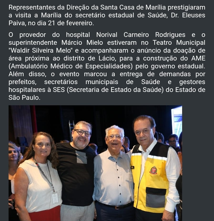 O provedor do hospital Norival Carneiro Rodrigues e o superintendente Márcio Mielo estiveram no Teatro Municipal “Waldir Silveira Melo” e acompanharam o anúncio da doação de área próxima ao distrito de Lácio, para a construção do AME (Ambulatório Médico de Especialidades) pelo governo estadual. Além disso, o evento marcou a entrega de demandas por prefeitos, secretários municipais de Saúde e gestores hospitalares à SES (Secretaria de Estado da Saúde) do Estado de São Paulo.