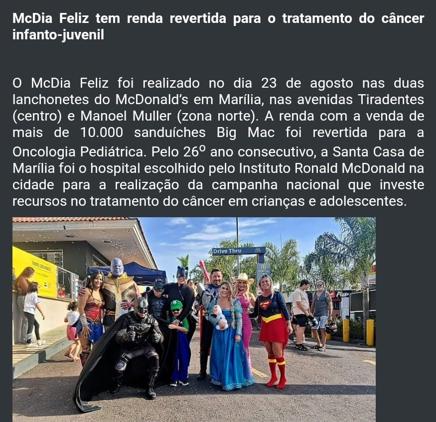 O McDia Feliz foi realizado no dia 23 de agosto nas duas lanchonetes do McDonald’s em Marília, nas avenidas Tiradentes (centro) e Manoel Muller (zona norte). A renda com a venda de mais de 10.000 sanduíches Big Mac foi revertida para a Oncologia Pediátrica. Pelo 26o ano consecutivo, a Santa Casa de Marília foi o hospital escolhido pelo Instituto Ronald McDonald na cidade para a realização da campanha nacional que investe recursos no tratamento do câncer em crianças e adolescentes.