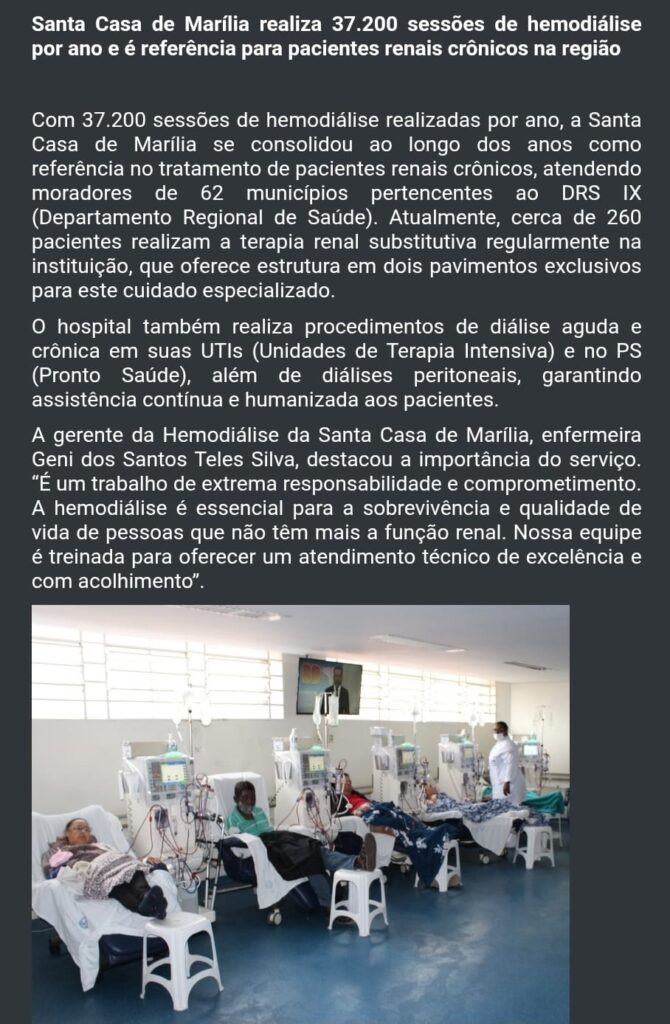 3) Santa Casa de Marília realiza 37.200 sessões de hemodiálise por ano e é referência para pacientes renais crônicos na região