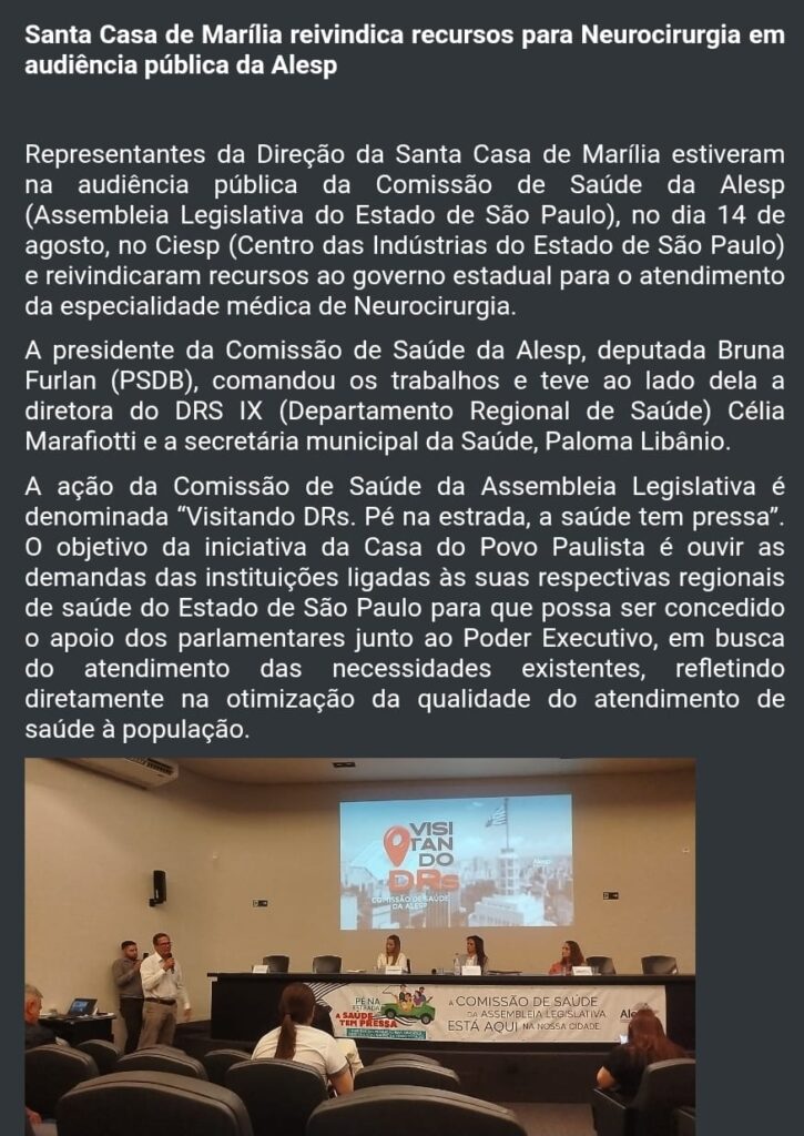 Representantes da Direção da Santa Casa de Marília estiveram na audiência pública da Comissão de Saúde da Alesp (Assembleia Legislativa do Estado de São Paulo), no dia 14 de agosto, no Ciesp (Centro das Indústrias do Estado de São Paulo) e reivindicaram recursos ao governo estadual para o atendimento da especialidade médica de Neurocirurgia.