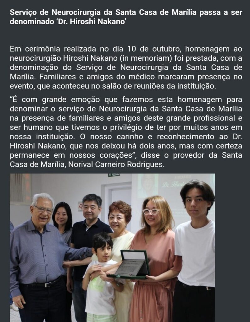 Em cerimônia realizada no dia 10 de outubro, homenagem ao neurocirurgião Hiroshi Nakano (in memoriam) foi prestada, com a denominação do Serviço de Neurocirurgia da Santa Casa de Marília. Familiares e amigos do médico marcaram presença no evento, que aconteceu no salão de reuniões da instituição.