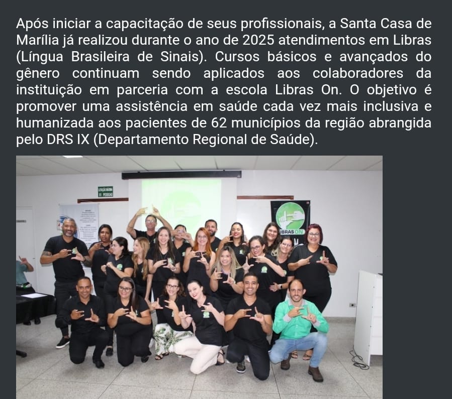 Após iniciar a capacitação de seus profissionais, a Santa Casa de Marília já realizou durante o ano de 2025 atendimentos em Libras (Língua Brasileira de Sinais). Cursos básicos e avançados do gênero continuam sendo aplicados aos colaboradores da instituição em parceria com a escola Libras On. O objetivo é promover uma assistência em saúde cada vez mais inclusiva e humanizada aos pacientes de 62 municípios da região abrangida pelo DRS IX (Departamento Regional de Saúde).