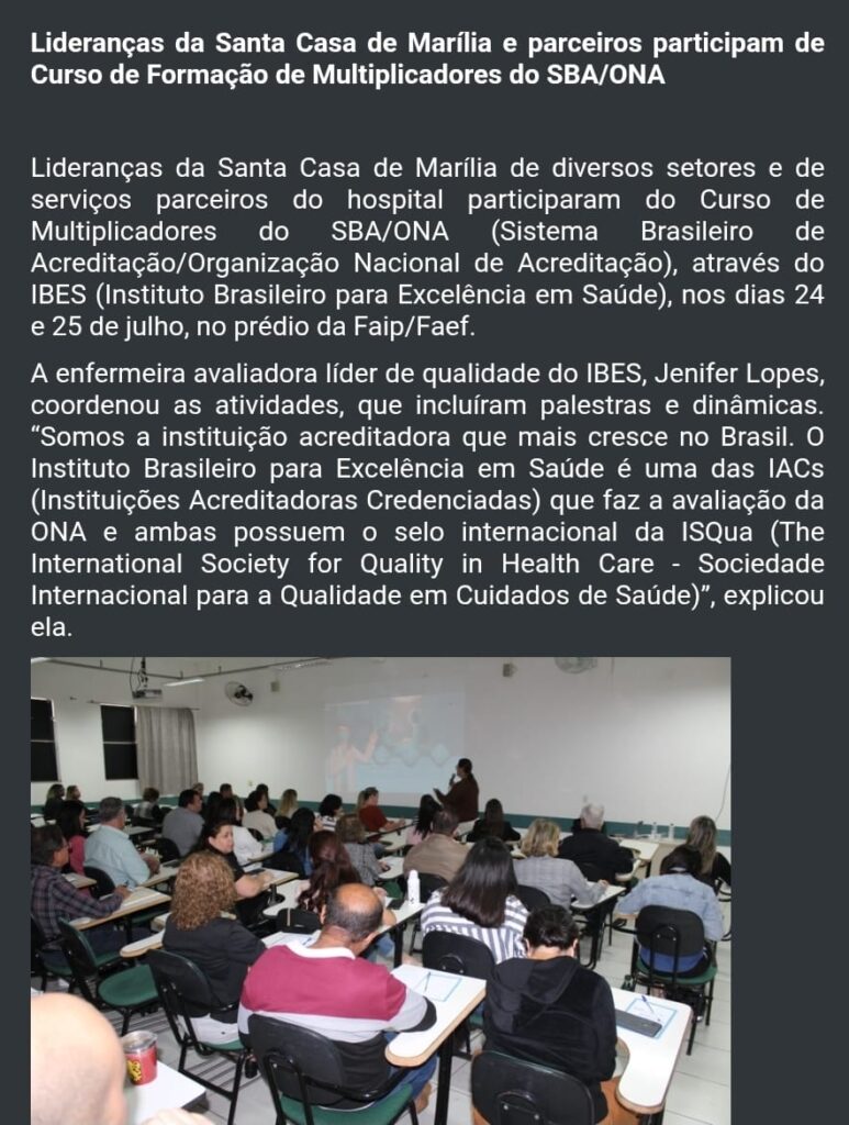 Lideranças da Santa Casa de Marília de diversos setores e de serviços parceiros do hospital participaram do Curso de Multiplicadores do SBA/ONA (Sistema Brasileiro de Acreditação/Organização Nacional de Acreditação), através do IBES (Instituto Brasileiro para Excelência em Saúde), nos dias 24 e 25 de julho, no prédio da Faip/Faef.