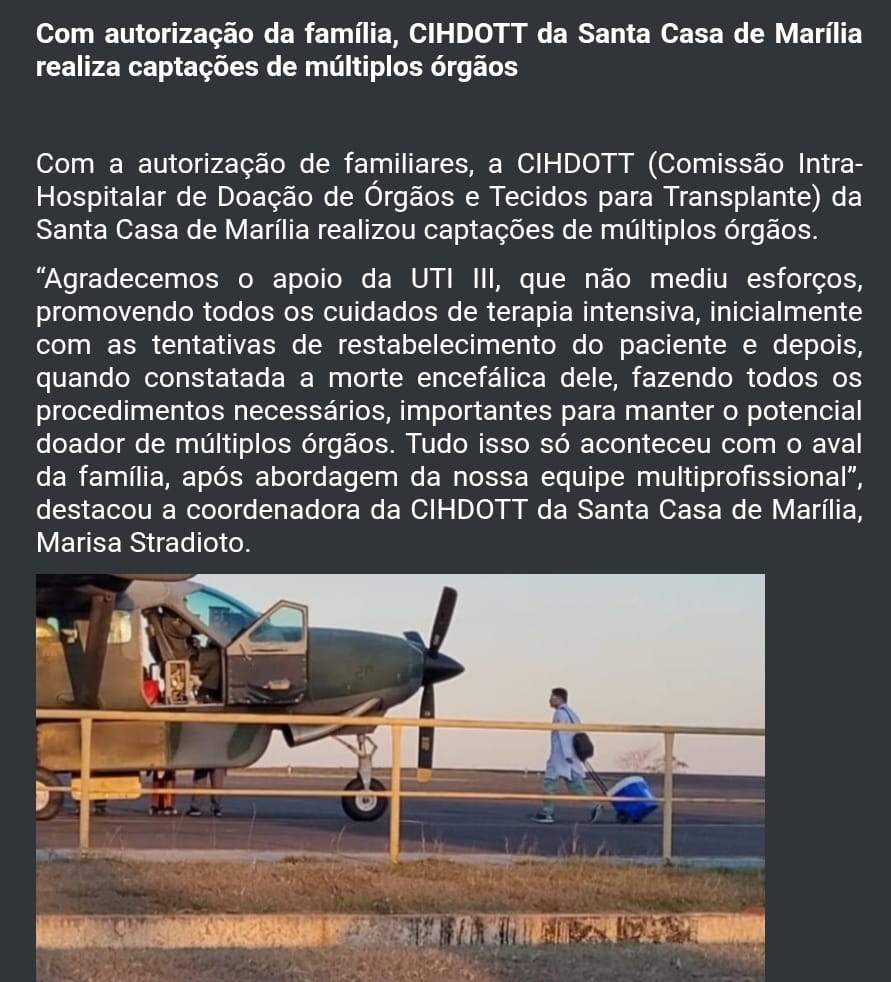 Paciente de 41 anos, que sofreu politraumas e estava internado na unidade hospitalar filantrópica mariliense no segundo semestre de 2025, foi o doador. Ele vinha recebendo todos os cuidados da equipe da UTI (Unidade de Terapia Intensiva) III da Santa Casa de Marília, porém, teve a morte encefálica dele confirmada no dia 29 de agosto. Equipe de hospital de São Paulo esteve em Marília para participar da captação dos órgãos, com a retaguarda de avião cedido pela FAB (Força Aérea Brasileira), para que fosse possível efetuar a tempo os transplantes posteriormente.