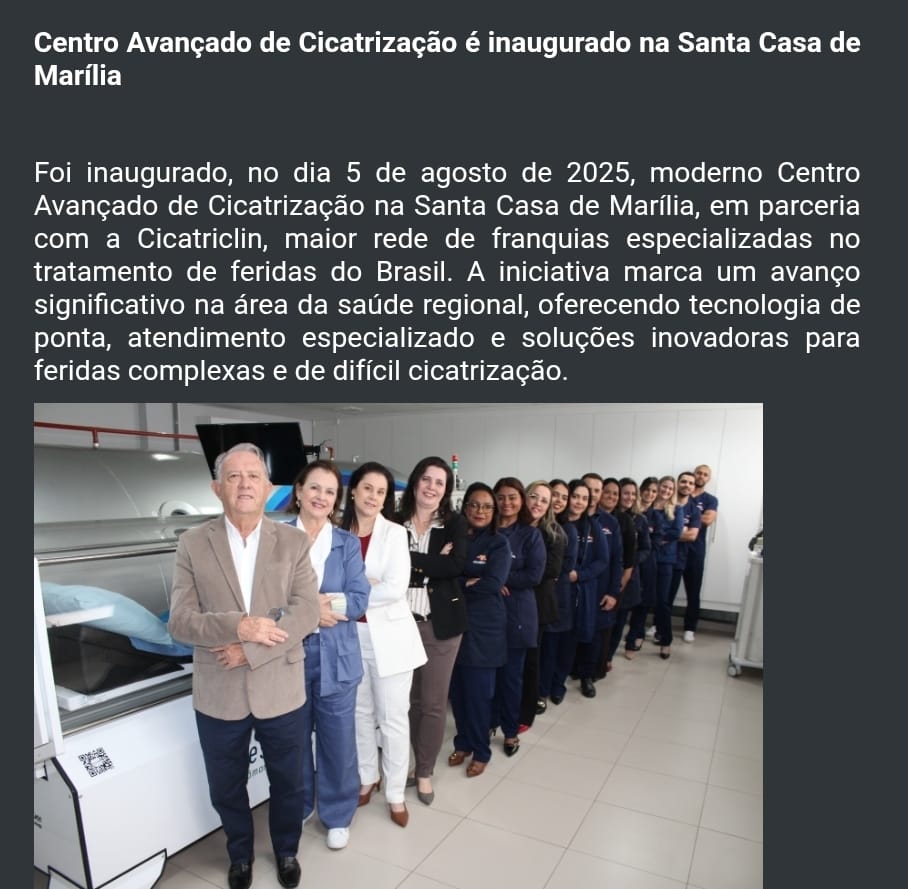 Foi inaugurado, no dia 5 de agosto de 2025, moderno Centro Avançado de Cicatrização na Santa Casa de Marília, em parceria com a Cicatriclin, maior rede de franquias especializadas no tratamento de feridas do Brasil. A iniciativa marca um avanço significativo na área da saúde regional, oferecendo tecnologia de ponta, atendimento especializado e soluções inovadoras para feridas complexas e de difícil cicatrização.