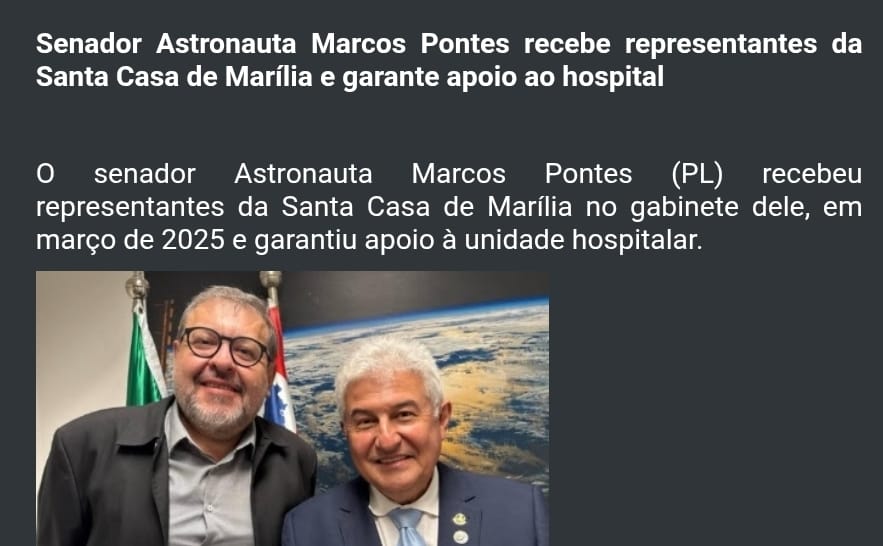 O senador Astronauta Marcos Pontes (PL) recebeu representantes da Santa Casa de Marília no gabinete dele, em março de 2025 e garantiu apoio à unidade hospitalar.