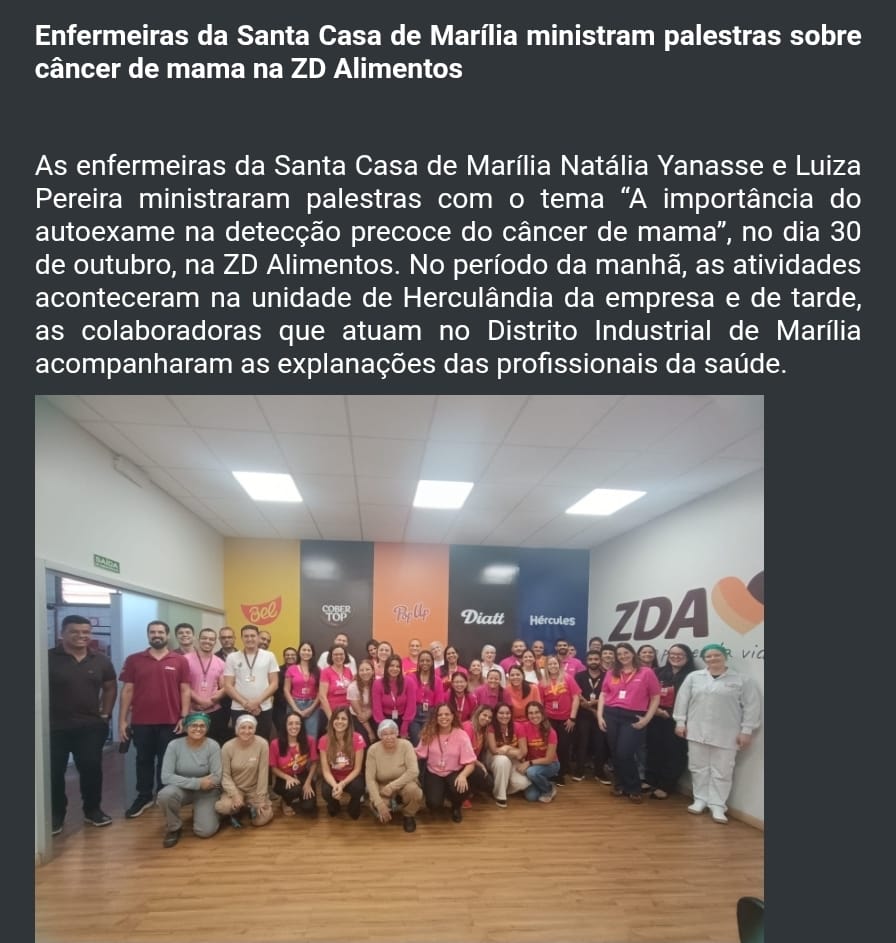 A Santa Casa de Marília agradeceu à ZD Alimentos pela abertura e pelo apoio à campanha, destacando que a conscientização é um dos pilares mais importantes na luta contra o câncer de mama.