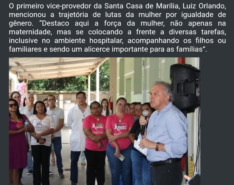 O primeiro vice-provedor da Santa Casa de Marília, Luiz Orlando, mencionou a trajetória de lutas da mulher por igualdade de gênero. “Destaco aqui a força da mulher, não apenas na maternidade, mas se colocando a frente a diversas tarefas, inclusive no ambiente hospitalar, acompanhando os filhos ou familiares e sendo um alicerce importante para as famílias”.