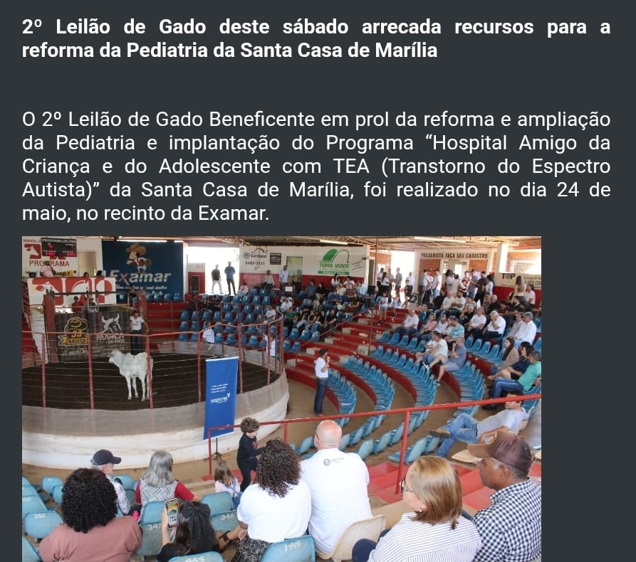 O 2º Leilão de Gado Beneficente em prol da reforma e ampliação da Pediatria e implantação do Programa “Hospital Amigo da Criança e do Adolescente com TEA (Transtorno do Espectro Autista)” da Santa Casa de Marília, foi realizado no dia 24 de maio, no recinto da Examar.