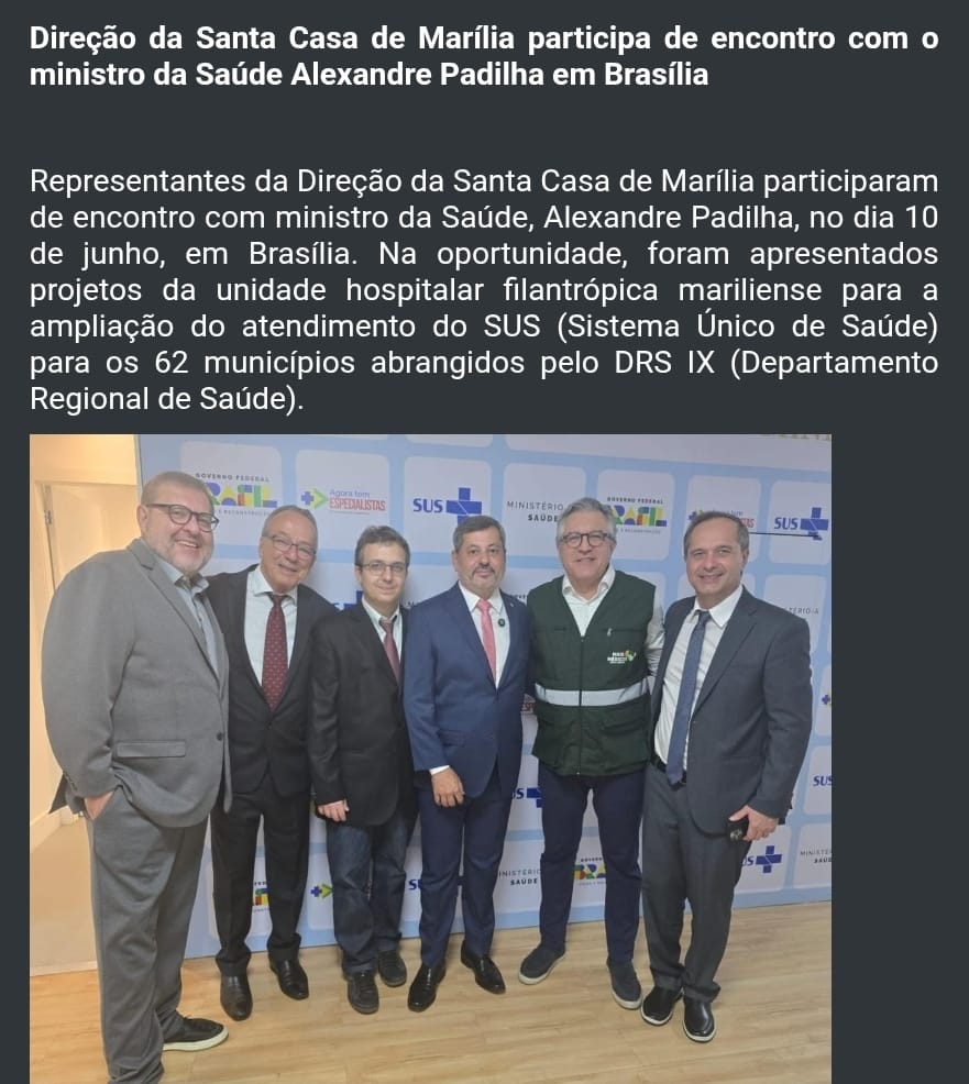 Representantes da Direção da Santa Casa de Marília participaram de encontro com ministro da Saúde, Alexandre Padilha, no dia 10 de junho, em Brasília. Na oportunidade, foram apresentados projetos da unidade hospitalar filantrópica mariliense para a ampliação do atendimento do SUS (Sistema Único de Saúde) para os 62 municípios abrangidos pelo DRS IX (Departamento Regional de Saúde).