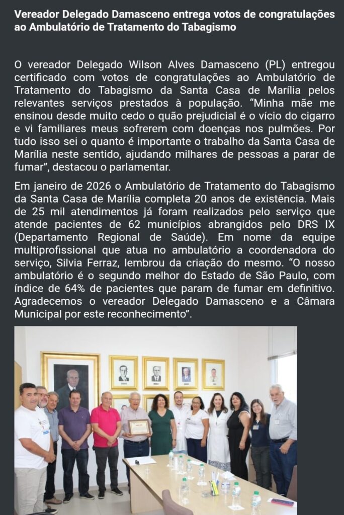 Em janeiro de 2026 o Ambulatório de Tratamento do Tabagismo da Santa Casa de Marília completa 20 anos de existência. Mais de 25 mil atendimentos já foram realizados pelo serviço que atende pacientes de 62 municípios abrangidos pelo DRS IX (Departamento Regional de Saúde). Em nome da equipe multiprofissional que atua no ambulatório a coordenadora do serviço, Silvia Ferraz, lembrou da criação do mesmo. “O nosso ambulatório é o segundo melhor do Estado de São Paulo, com índice de 64% de pacientes que param de fumar em definitivo. Agradecemos o vereador Delegado Damasceno e a Câmara Municipal por este reconhecimento”.