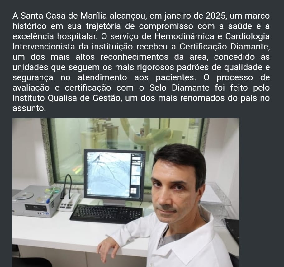 A Santa Casa de Marília alcançou, em janeiro de 2025, um marco histórico em sua trajetória de compromisso com a saúde e a excelência hospitalar. O serviço de Hemodinâmica e Cardiologia Intervencionista da instituição recebeu a Certificação Diamante, um dos mais altos reconhecimentos da área, concedido às unidades que seguem os mais rigorosos padrões de qualidade e segurança no atendimento aos pacientes. O processo de avaliação e certificação com o Selo Diamante foi feito pelo Instituto Qualisa de Gestão, um dos mais renomados do país no assunto.