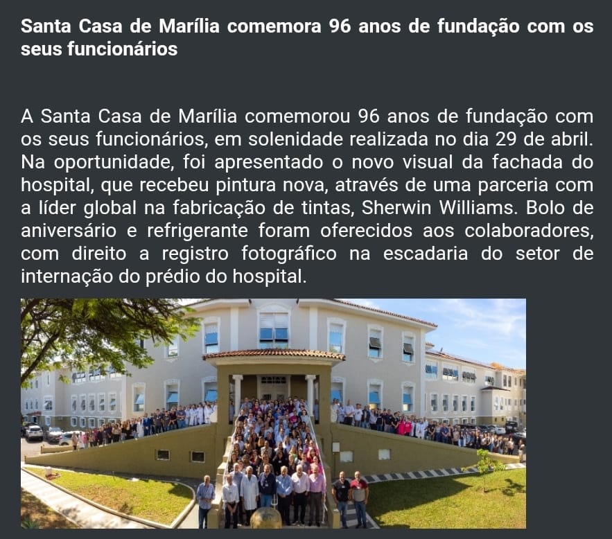 A Santa Casa de Marília comemorou 96 anos de fundação com os seus funcionários, em solenidade realizada no dia 29 de abril. Na oportunidade, foi apresentado o novo visual da fachada do hospital, que recebeu pintura nova, através de uma parceria com a líder global na fabricação de tintas, Sherwin Williams. Bolo de aniversário e refrigerante foram oferecidos aos colaboradores, com direito a registro fotográfico na escadaria do setor de internação do prédio do hospital.