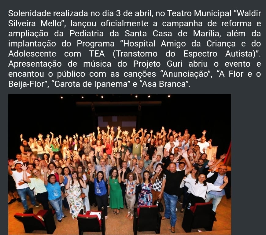 Solenidade realizada no dia 3 de abril, no Teatro Municipal “Waldir Silveira Mello”, lançou oficialmente a campanha de reforma e ampliação da Pediatria da Santa Casa de Marília, além da implantação do Programa “Hospital Amigo da Criança e do Adolescente com TEA (Transtorno do Espectro Autista)”. Apresentação de música do Projeto Guri abriu o evento e encantou o público com as canções “Anunciação”, “A Flor e o Beija-Flor”, “Garota de Ipanema” e “Asa Branca”.