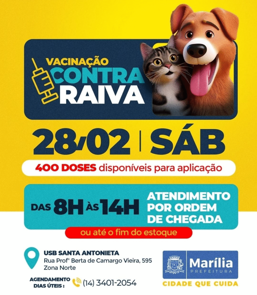Em janeiro, a ação aconteceu na USF (Unidade Saúde da Família) Altaneira, localizada na Rua Riachuelo, 139, no bairro Betel, zona Leste da cidade. Mais informações sobre a vacinação antirrábica podem ser obtidas na Divisão de Zoonoses pelo telefone (14) 3401-2054.