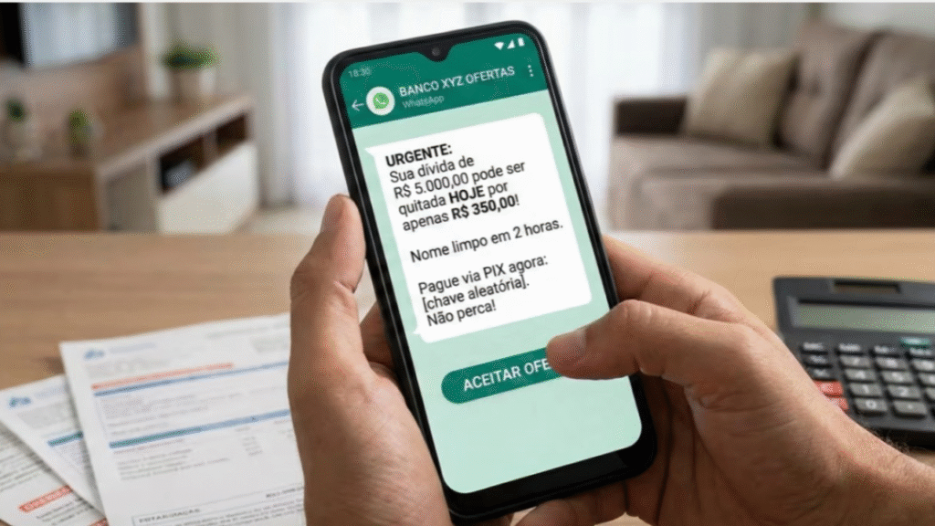 Você está devendo, o telefone vibra e a mensagem parece um alívio imediato. Promessa de desconto alto, quitação rápida e nome limpo em poucas horas. O problema é que, por trás dessa oferta tentadora, muitas vezes está o golpe da renegociação de dívida, um dos esquemas mais comuns e perigosos hoje no Brasil.